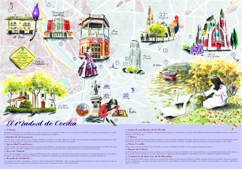 Andrea Reyes y yo, en conmemoración del 45 aniversario del fallecimiento de Cecilia, creamos para la revista ilustrada Eme21magazine este mapa con los lugares destacados de Madrid en la vida de la cantante. ¡Esperamos que os guste tanto como nosotros hemos disfrutado haciéndolo!