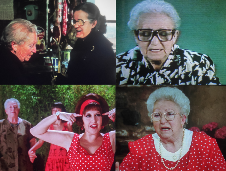 De izquierda a derecha y de arriba a abajo, Paquita Caballero en las cuatro películas de Almodóvar en las que participó: ¿Qué he hecho yo para merecer esto!, Mujeres al borde de un ataque de nervios, Átame y Kika.