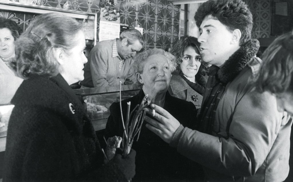 Chus Lampreave, Paquita Caballero, Carmen Maura y Almodóvar durante el rodaje de ¿Qué he hecho yo para merecer esto!