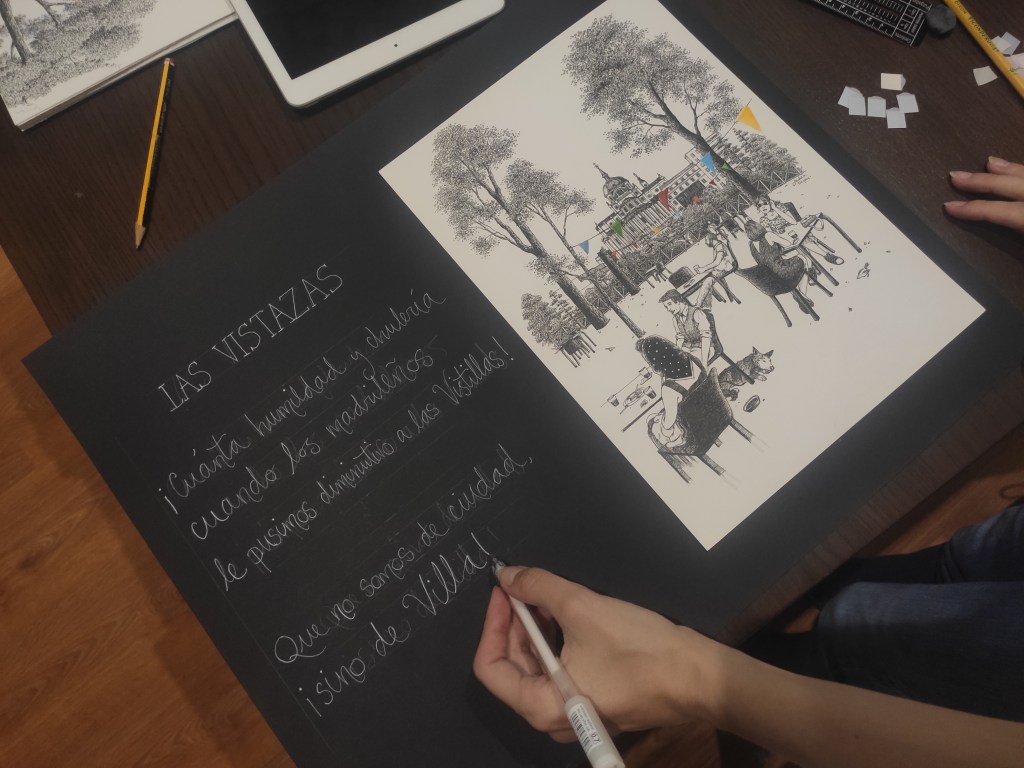 Madrid coincide con la poesía en una misma paradoja: es deliciosa para disfrutarla solo, y a la vez su existencia no sería posible si no la compartiéramos con los demás. En Poeta en Madrid, Pedro Sánchez Castrejón nos hace cómplices de las emociones y pensamientos que la ciudad y sus habitantes le despiertan, y la artista Andrea Reyes le acompaña en ese íntimo recorrido literario ilustrando algunos de los rincones más emblemáticos de la capital, como el cine Doré, las Vistillas, el Templo de Debod, el Museo del Prado, la plaza de Oriente o la Puerta del Sol, entre otros.
